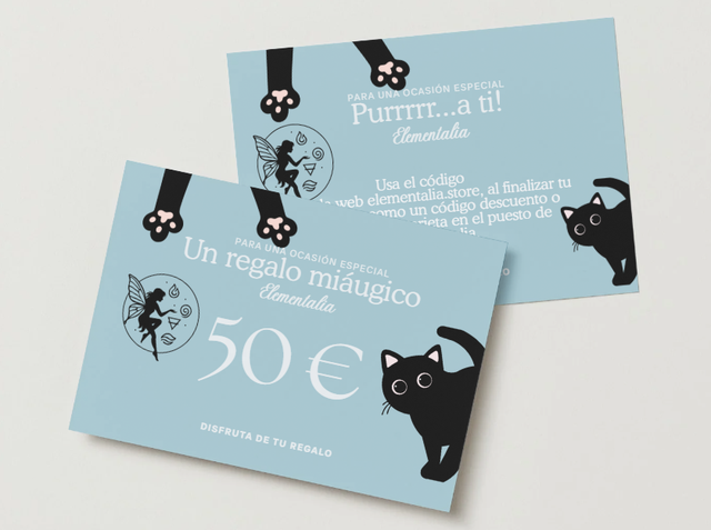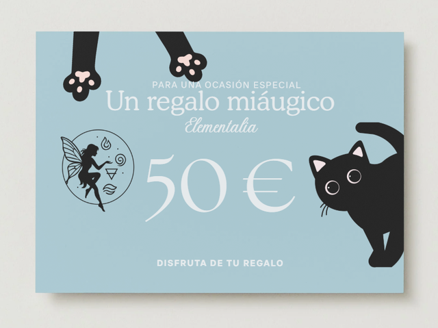 Regala magia, bienestar y energía positiva con la Tarjeta Regalo de Elementalia con diseño gatito, perfecta para sorprender a tus seres queridos. Les permitirá elegir entre inciensos, cristales, hadas, amuletos y otros productos cargados de intención y armonía.